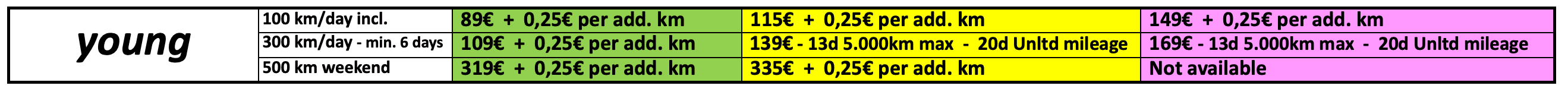 - Prices are in Euros per day, VAT included. Week end starts from Friday at 5.30 pm