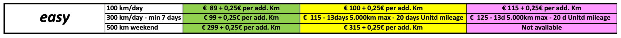 - Prices are in Euros per day, VAT included. Week end starts from Friday at 5.30 pm